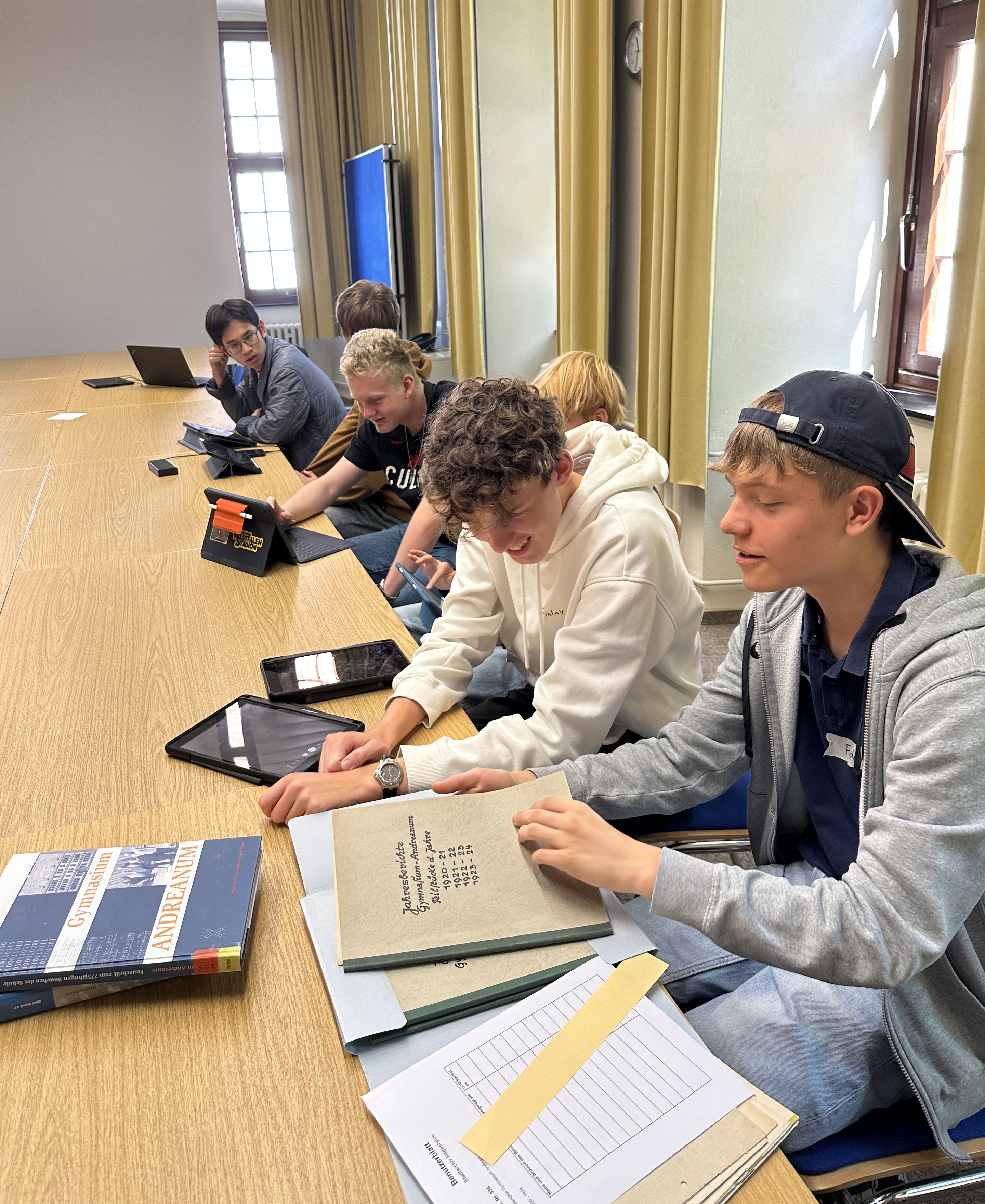 Im Rahmen der Projektwoche „Gemeinsam 800“ hat die Projektgruppe „Scan deine Schule“ in der Schule und im Stadtarchiv in Büchern, alten Zeitungsartikeln und Jahresberichten gestöbert und einige Informationen zu unserer Schule zusammengetragen.