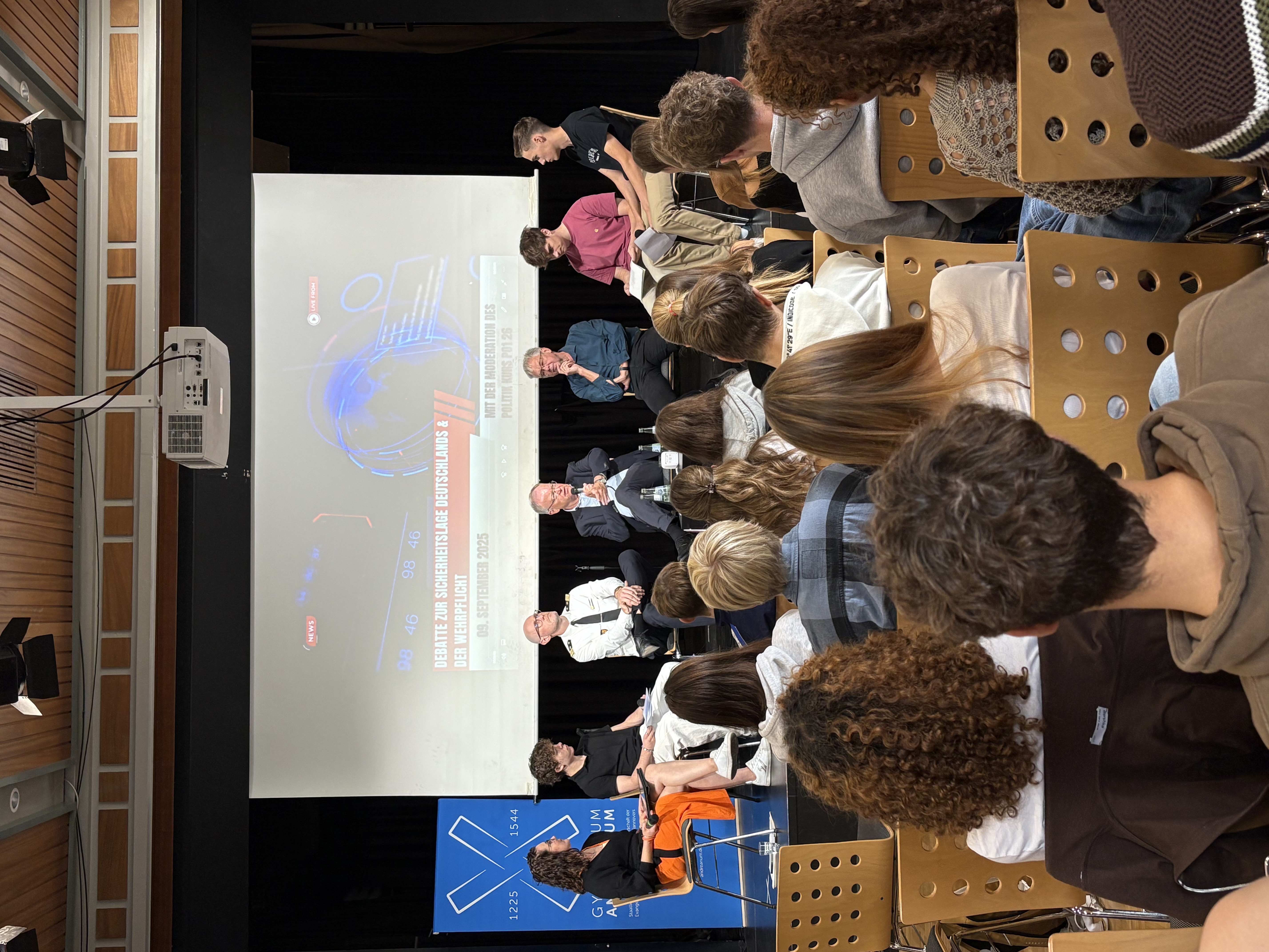 Am 9. September 2025 diskutierten im Rahmen der Politikwoche der Oberstufe im Telemannsaal drei Gäste mit Schülerinnen und Schülern über die Frage „Sicherheit durch Aufrüstung?“.